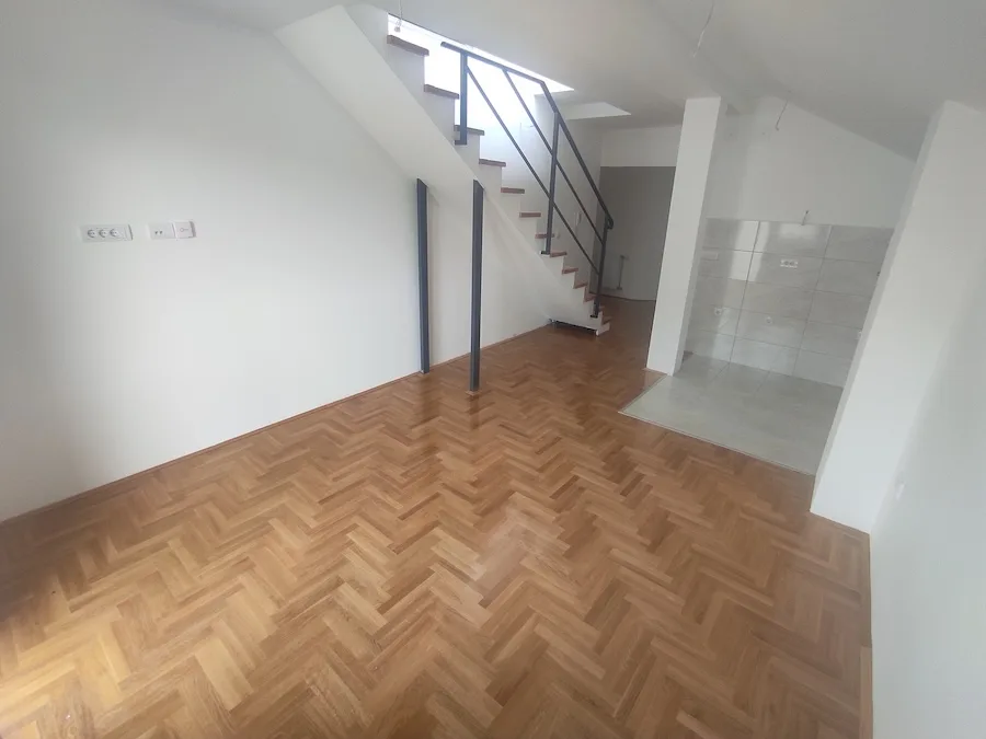 Dupleks stan. I nivo: dnevni boravak+kuhinja+trpezarija, kupatilo, terasa. II nivo: 2 spavaće, hodnik.